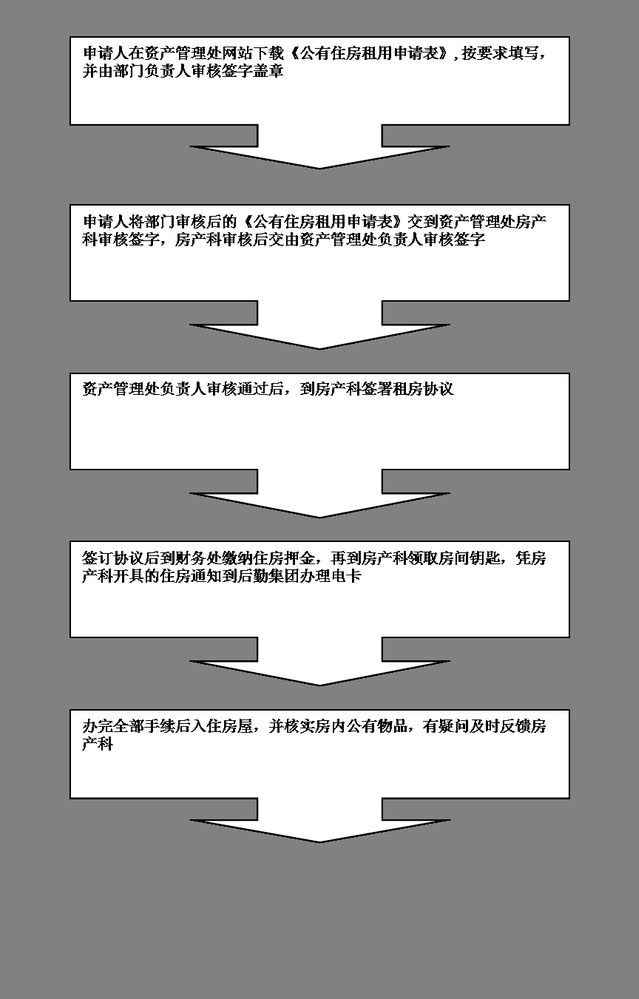 一、事项名称:公有住房申请工作二、部门名称:国有资产管理处房产科三、服务对象:学校各部门四、服务流程:见公有住房申请工作流程图五、工作地点:行政楼106室六、经办人员姓名:匡辉 办公电话:027-52104559、027-52104808工作时间:工作日上午8:00-11:30 下午14:00-17:30工作职责:负责房产管理工作服务承诺:恪尽职守,勇于担当,廉洁自律,优质服务七、公有住房申请工作流程图