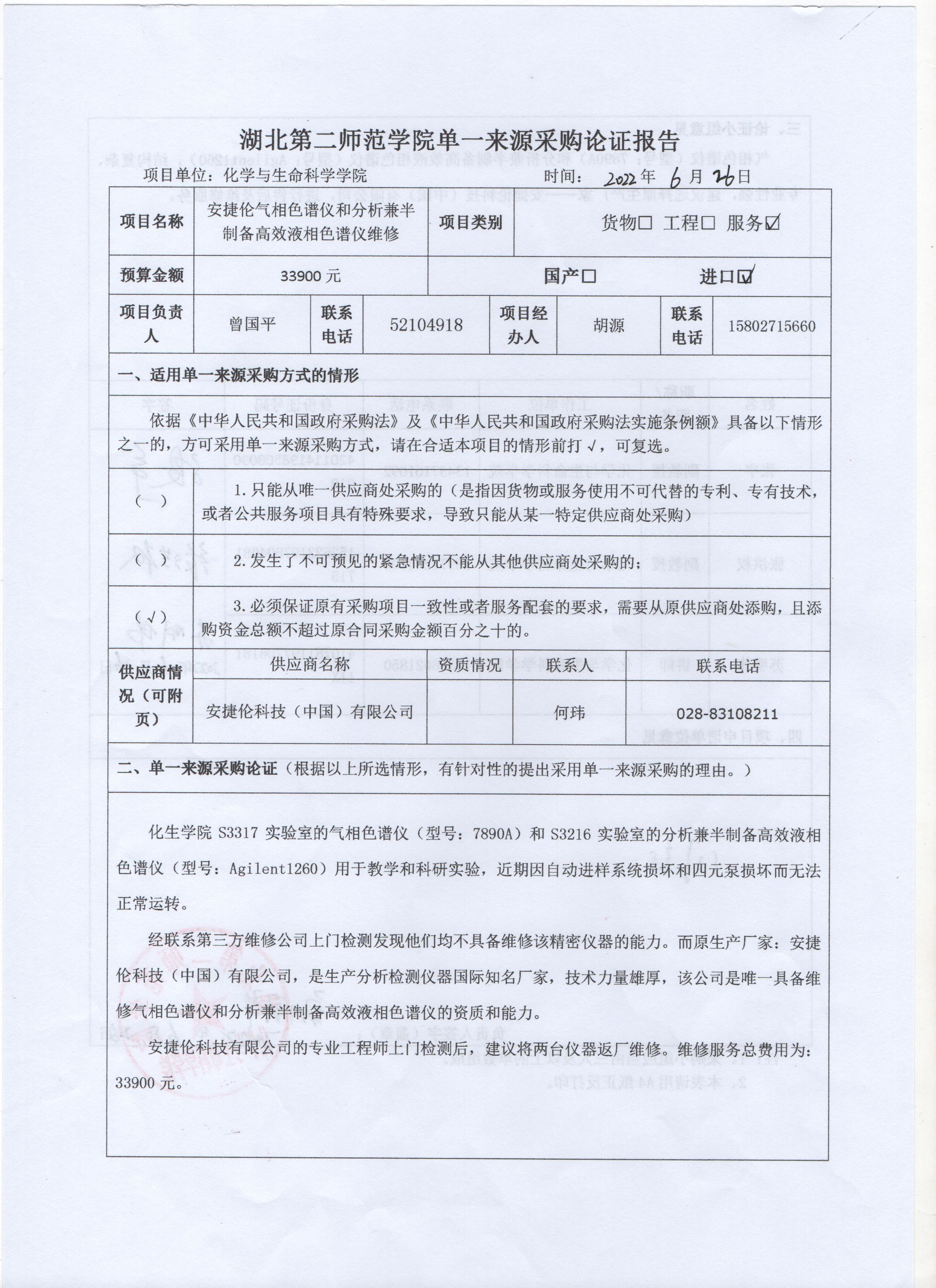 采用单一来源采购方式的原因及说明:需维修的气相色谱仪和分析兼半制备高效液相色谱仪购价高、结构复杂、专业性强,故选择原生产厂家安捷伦科技(中国)有限公司维修。