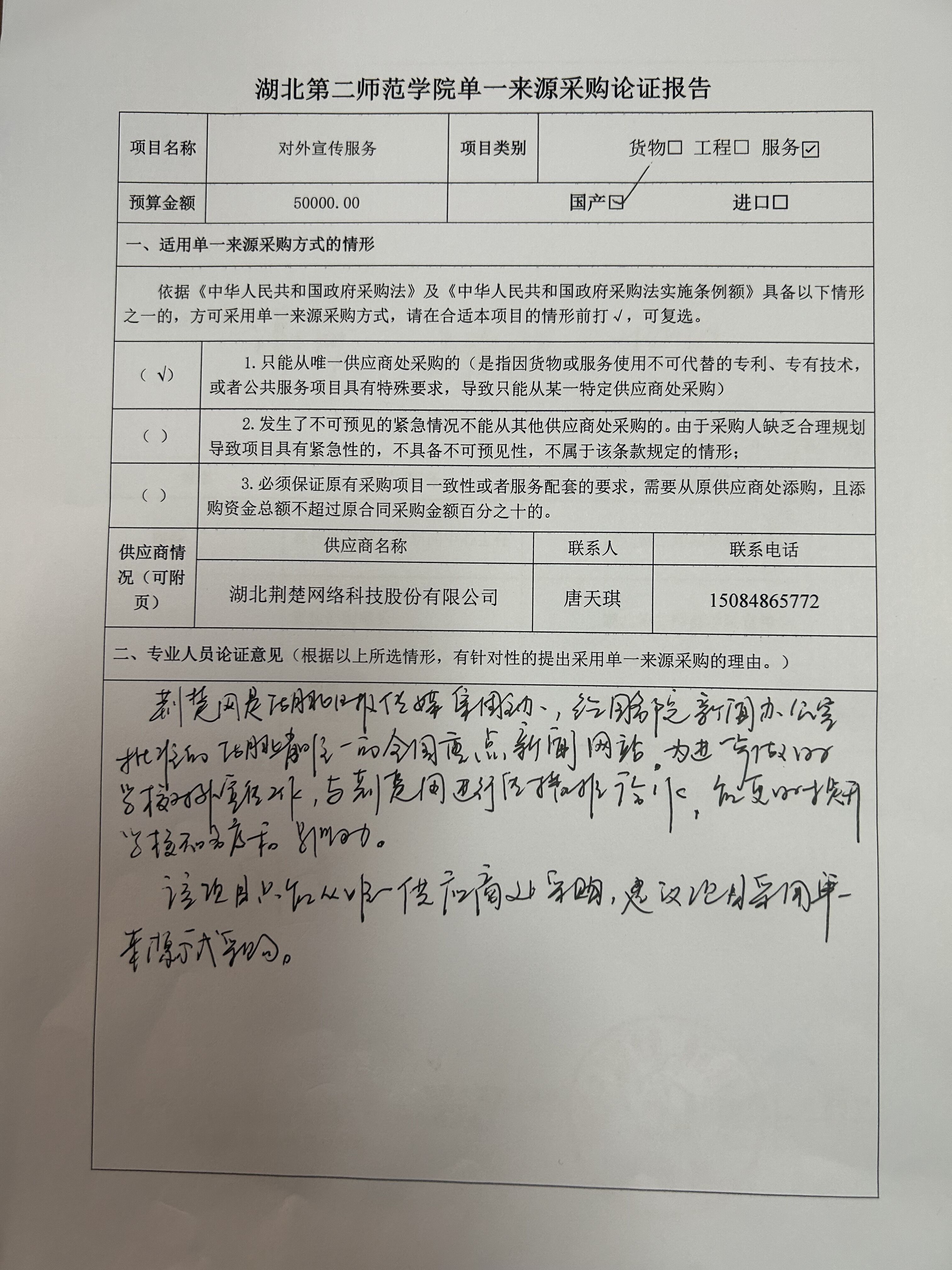 采用单一来源采购方式的原因及说明:荆楚网由中共湖北省委宣传部、湖北省人民政府新闻办公室主管,湖北日报传媒集团主办,是经国务院新闻办公室批准的湖北省唯一的全国重点新闻网站,依托荆楚网平台加强对学校对外宣传,能更好的提升学校知名度和影响力。