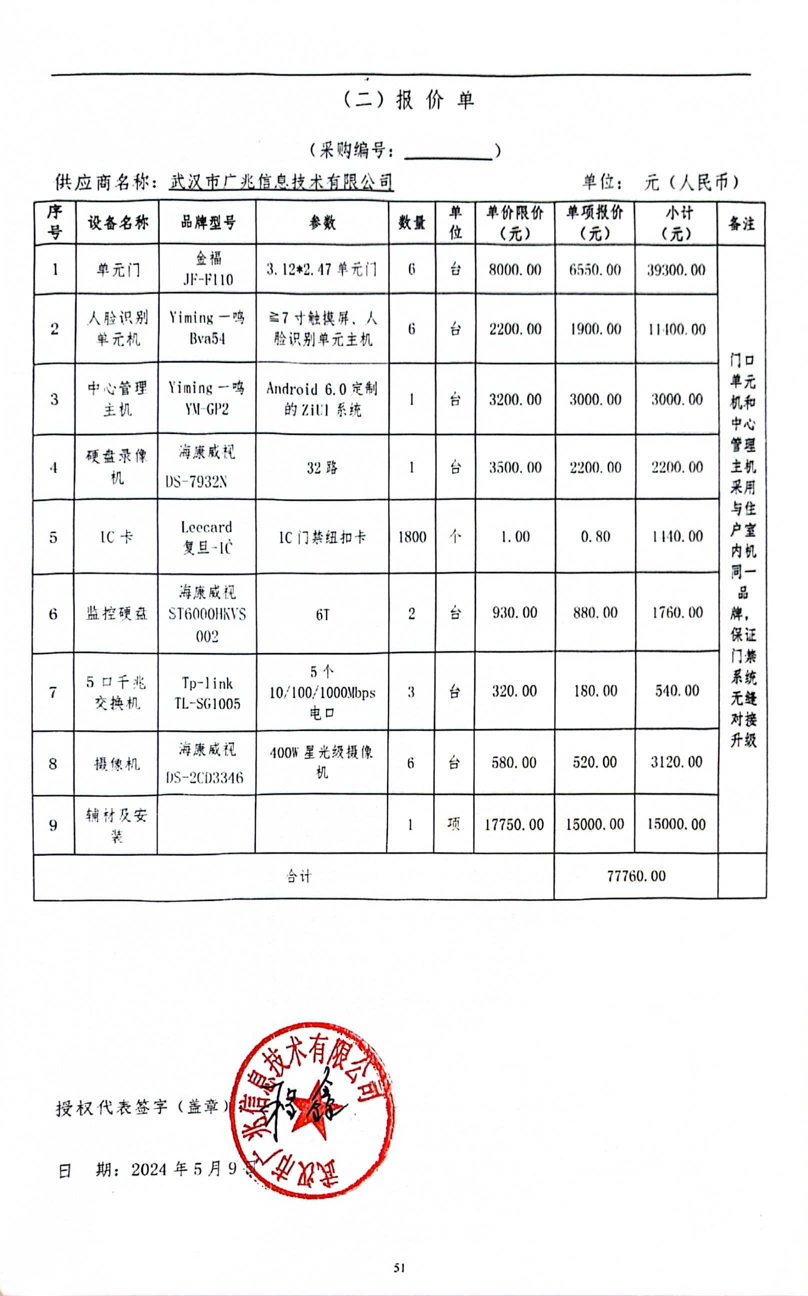 湖北第二师范学院后勤保障部,对教师公寓门栋监控设备购置项目进行了询价采购。工作已于2024年5月10日顺利结束,经采购小组评议,确定成交结果如下: